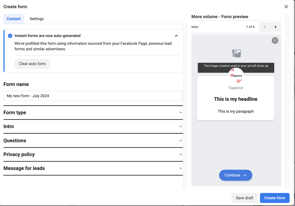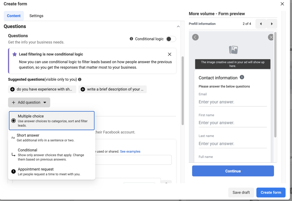 In the “Prefill questions” part, ask for necessary details like name and email. Facebook/Meta offers other options like date of birth, gender, etc. Only ask for what you need, as too many fields can lead to abandonment.