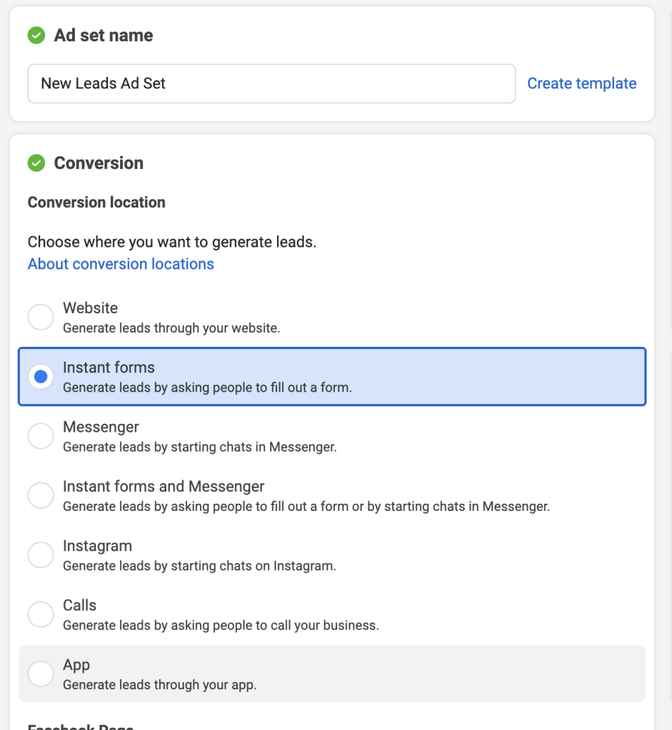 Within the ad set’s settings, make sure you choose “Instant forms” as the conversion location (you can also choose “Instant forms and Messenger,” but we’ll focus on instant forms):