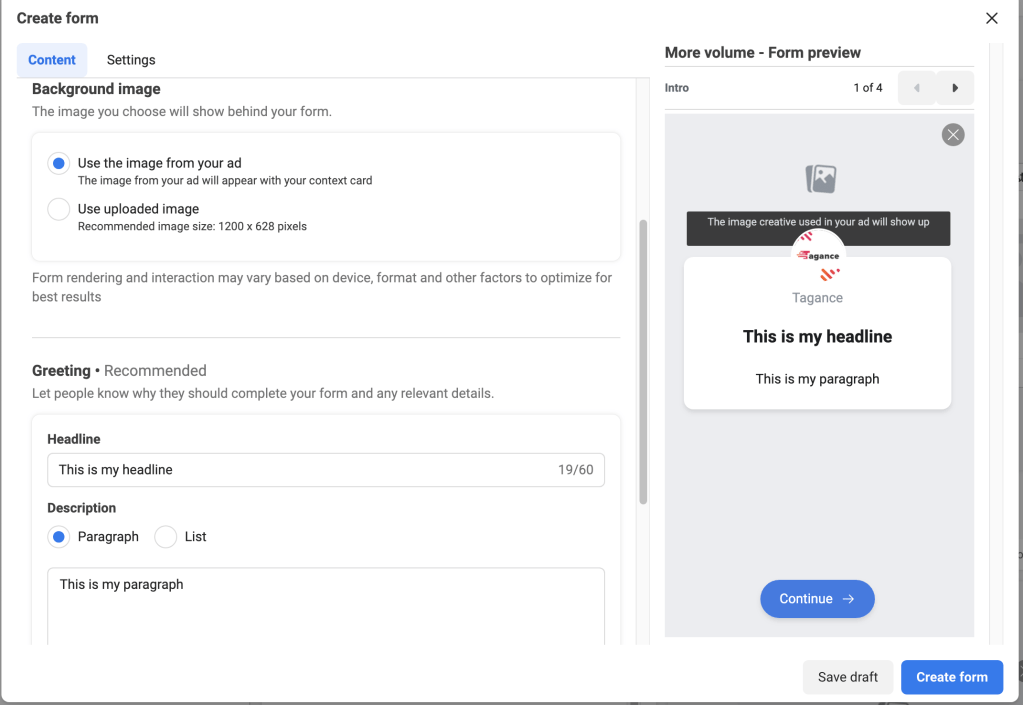 Next, add content to the form. Start with a cover image, followed by a headline and descriptive text, similar to a traditional landing page. Be precise with your messaging and describe what the lead should expect (e.g., newsletter signup, gift, sales call).